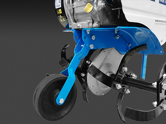 Опорное колесо упрощает перемещение мотокультиватора на фрезах по необработанному участку. Установив колесо в нижнее положение, можно с легкостью перекатить технику. При этом ножи фрез, не соприкасаясь с твердой поверхностью, сохраняют необходимую для качественной культивации остроту. Также если пользователь работает без помощников, то наличие опорного колеса значительно упрощает процедуру смены фрез на грунтозацепы. Для того, чтобы стабилизировать изделие, достаточно поставить опорное колесо и руль в нижнее положение.
