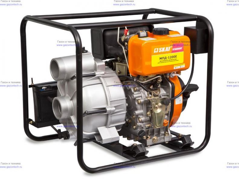 Грязевая мотопомпа МПД-1200Е предназначена для перекачивания загрязнённой воды, в которой содержатся частицы песка, листьев и других примесей размером до 25 мм. Для быстрой очистки механизма насоса от засорения предусмотрена его ускоренная разборка. Даже при отсутствии слесарного инструмента корпус насосной части легко разъединяется благодаря применению шпилек с рукоятками.